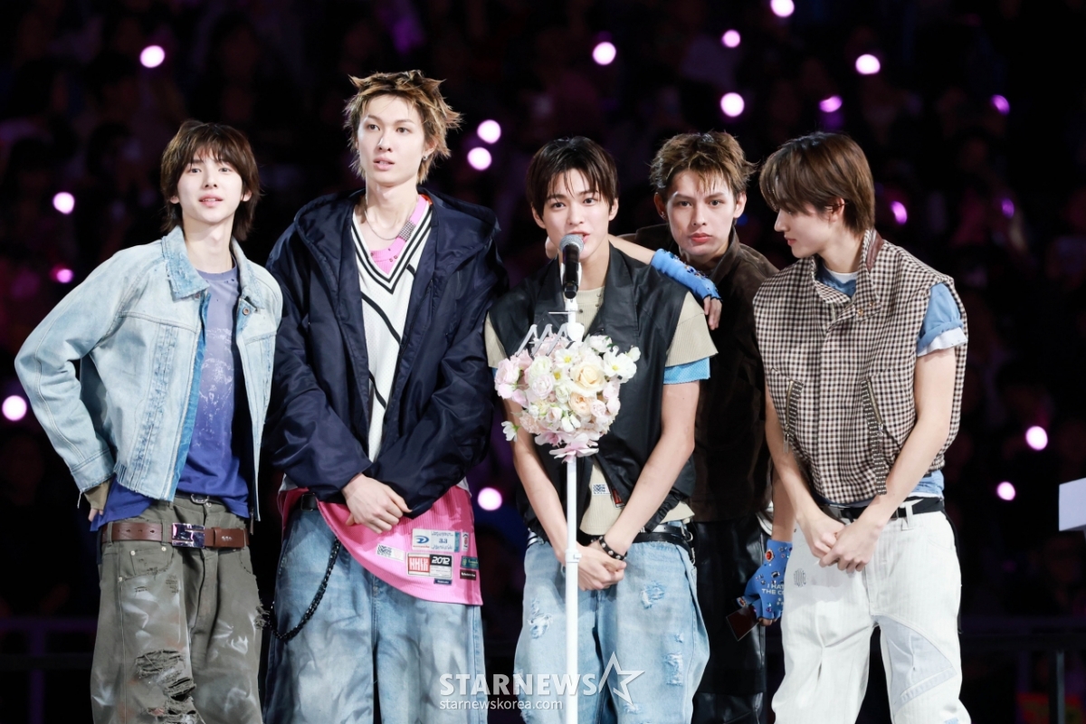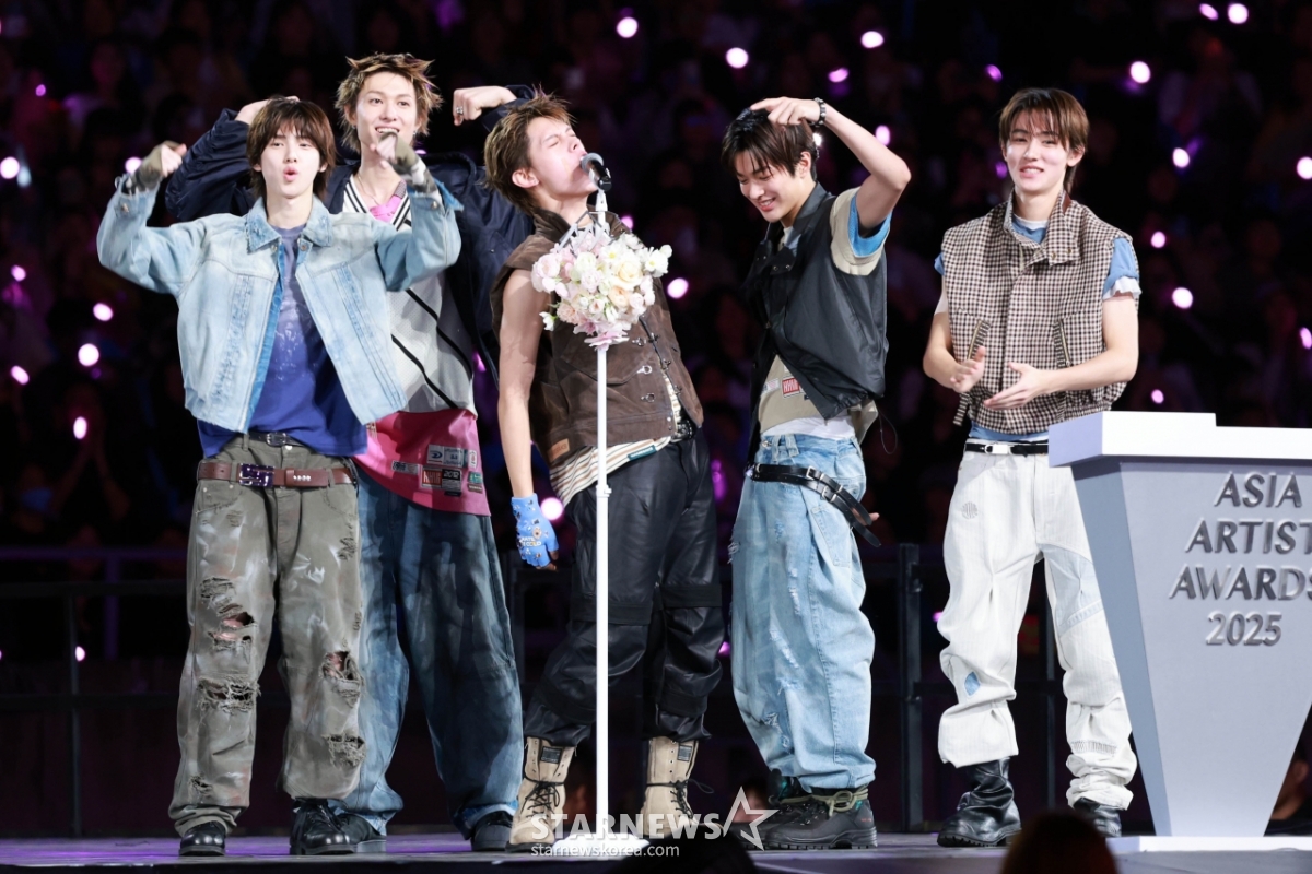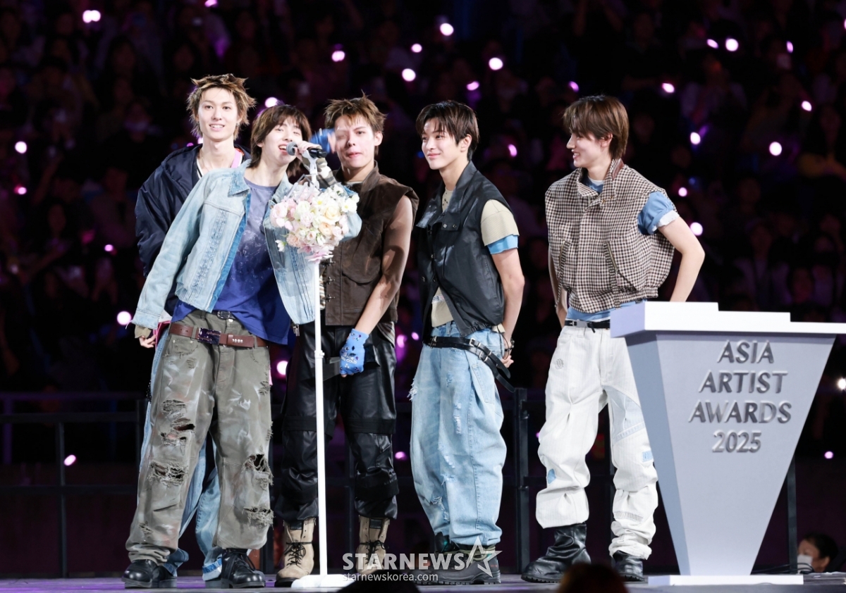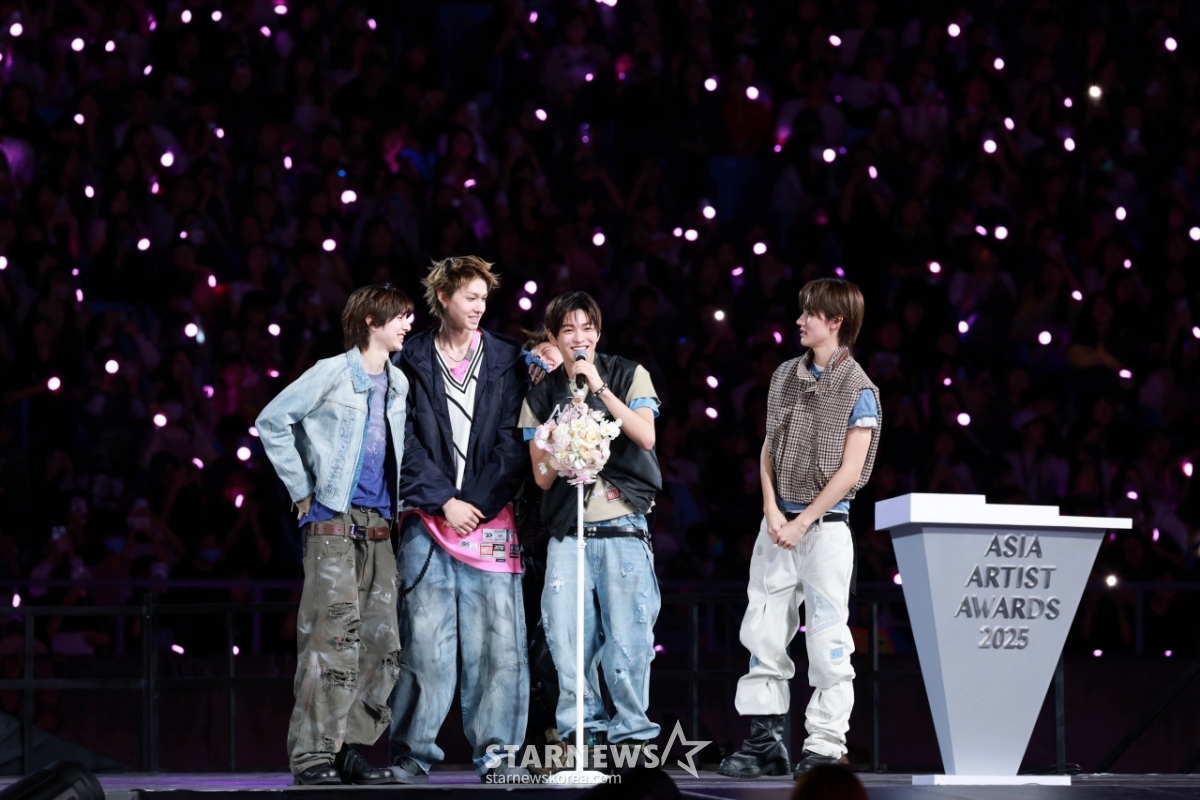 그룹 코르티스(CORTIS)가 6일 가오슝 내셔널 스타디움에서 진행된 스타뉴스 주최 '10주년 아시아 아티스트 어워즈 2025(10th Anniversary Asia Artist Awards 2025, '10주년 AAA 2025')에서 AAA Rookie of the Year상을 받고 수상소감을 말하고 있다.