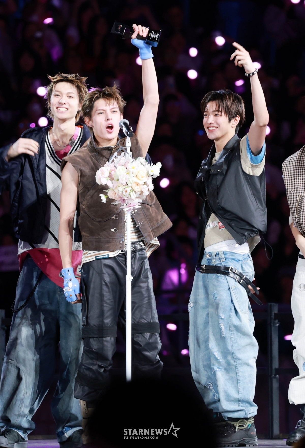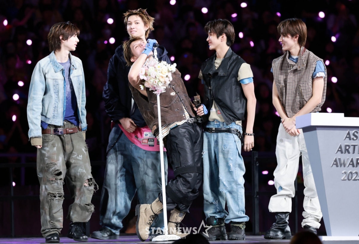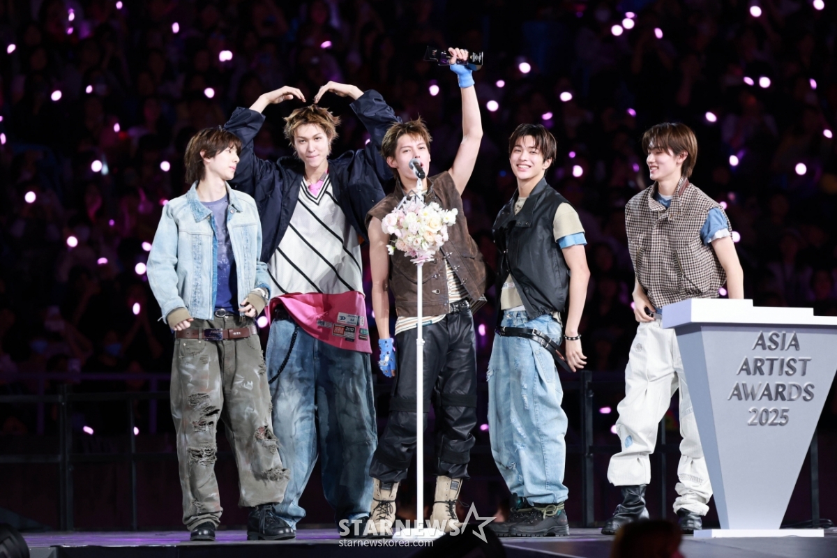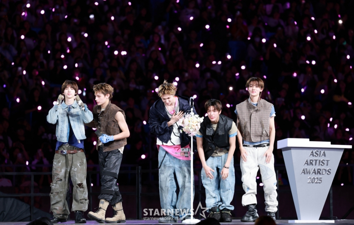 그룹 코르티스(CORTIS)가 6일 가오슝 내셔널 스타디움에서 진행된 스타뉴스 주최 '10주년 아시아 아티스트 어워즈 2025(10th Anniversary Asia Artist Awards 2025, '10주년 AAA 2025')에서 AAA Rookie of the Year상을 받고 수상소감을 말하고 있다.