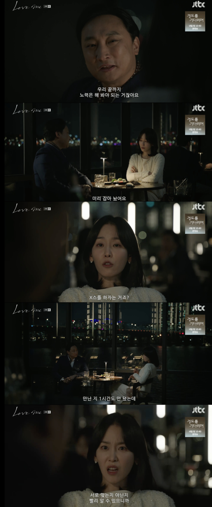 이날 방송은 서준경이 한 바에서 소개팅을 하는 장면으로 시작됐다. 소개팅남은 대뜸 "우리 딱 보면 알지 않냐. 저한테 안 끌리시죠?"라고 물었고, 서준경이 "네"라고 답하자 "저도 마찬가지에요. 저는 사실 20대를 만나고 싶은데 양심이 좀 없어 보이기도 하고, 20대가 날 좋아해줄 리도 없고"라며 무례한 발언을 이어갔다.상황은 점점 선을 넘었다. 그는 "아까운 시간 내서 여기까지 나왔는데 서로 노력해봐야 하지 않겠냐"라며 미리 예약해둔 호텔 키를 내밀었다.