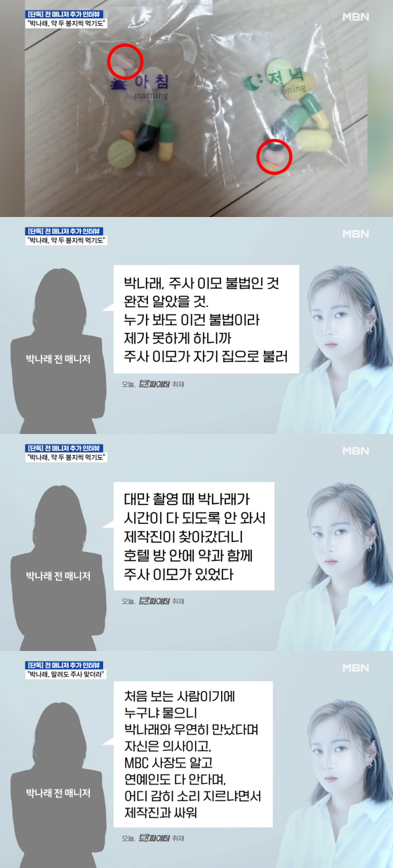 전 매니저는 "대만 촬영 때 박나래가 시간이 다 되도록 오지 않아서 제작진이 찾아갔더니 호텔 방 안에 약과 함께 주사 이모가 있었다"고 주장했다.