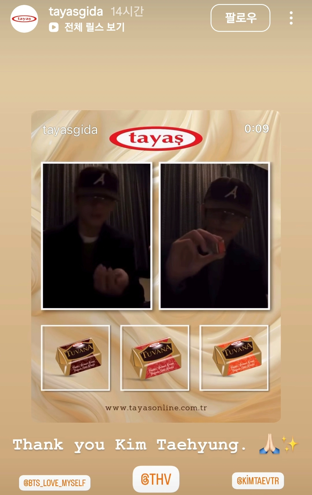 초콜릿 회사는 공식 SNS에 "작은 선물, 큰 미소. 오늘 우리는 아름다운 순간을 목격했다"며 뷔의 라이브 방송에서 뷔가 초콜릿을 들고 있는 모습을 공유하며 "우리에게 큰 행복과 동기부여가 됐다"고 뷔에게 고마움을 전했다.
