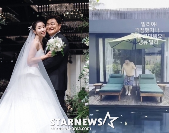 앞서 윤정수는 "내 신행 돌리도, 비야 멈춰라. 제발. 발리 발리야"라며 신혼여행 중 장대비가 내려 속상한 마음을 드러낸 바 있다. 함께 공개된 영상에는 비가 쏟아지는 발리의 모습이 담겨 눈길을 끌었다. 윤정수는 "실화인가? 비가 이렇게 오다니"라고 설명을 덧붙였다. 이에 네티즌들은 "우기철에 오셨어요. 내일은 맑을 거예요", "금방 그칠 거예요"라며 응원의 댓글을 남겼다.