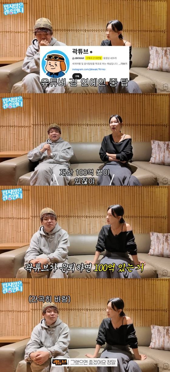 또 곽튜브는 재산 100억 설에 대해 언급하기도 했다. 그는 "돈 아예 없다. 100억설을 사람들이 믿나 보다. 저는 확실히 얘기할 수 있는 건, 진짜 장담하는데 제가 만약에 은퇴하면 100억이 있는 것이다. 100억이 있으면 무조건 은퇴한다"고 강조했다.