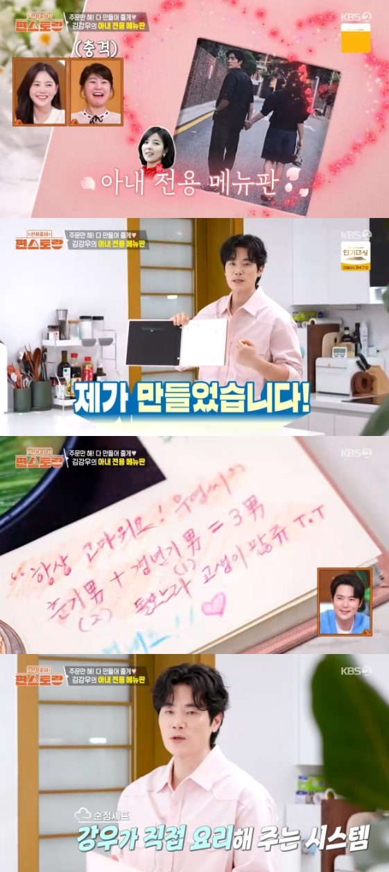 이날 김강우는 아내를 위해 손수 꾸민 메뉴판을 공개해 시선을 모았다. 메뉴판 속에는 오픈 토스트부터, 반죽 없는 치킨, 전복삼계탕, 안심 스테이크 등 아내가 좋아하는 온갖 레시피가 담겨있었다.