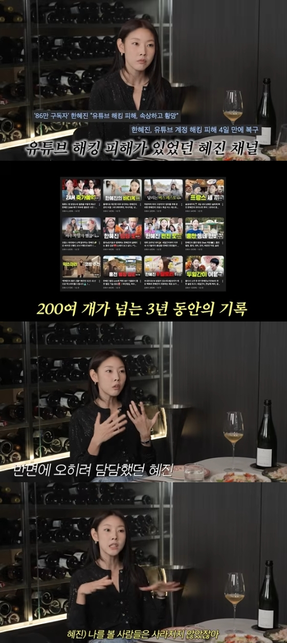그는 "어쨌든 나를 사랑해주고 나를 보길 원하는 분들은 그 자리에 있기 때문에 내가 설사 이걸 복구하지 못해도 나를 볼 사람들은 사라지지 않았다"라고 담담한 모습을 보였다. 한편 한혜진은 지난달 10일 발생한 해킹 피해로 채널 운영에 제약을 받았으나 4일 만에 복구해 86만 구독자와 재회했다.