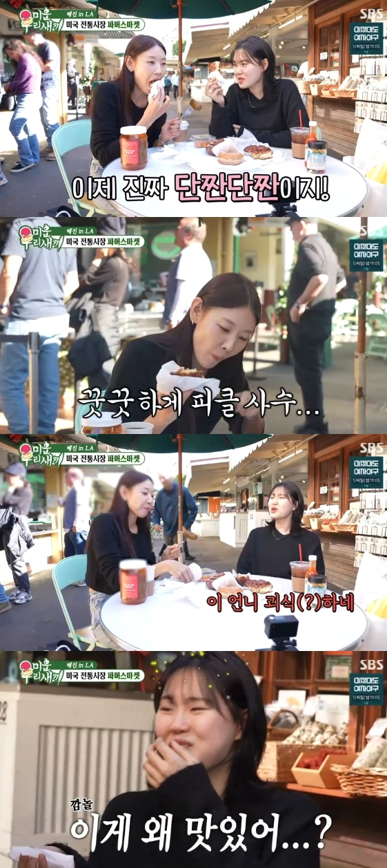 엄지윤은 한혜진의 거듭된 요청에 마지못해 한 입 맛 보더니 "미국에서 먹은 것 중에 제일 맛있다. 언니 미식가다"라고 말해 웃음을 자아냈다.