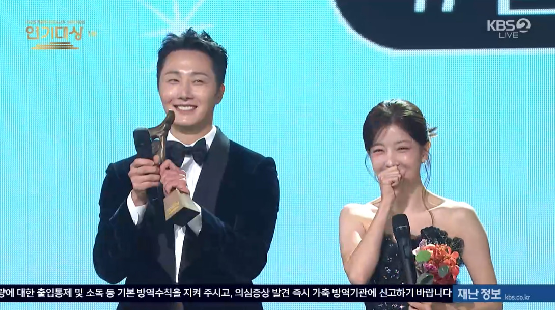 배우 이준영, 정은지가 인기상 트로피를 품에 안았다.