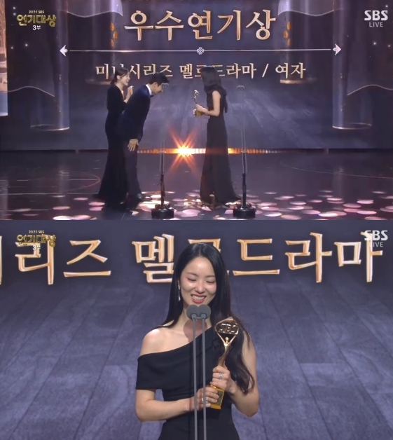 배우 전여빈이 '2025 SBS 연기대상'에서 미니시리즈 멜로드라마 부문 우수연기상 수상했다.