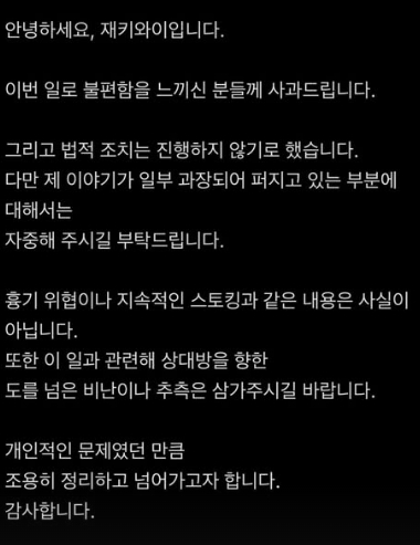 이와 관련, 재키와이는 "제 이야기가 일부 과장돼 퍼지고 있는 부분에 대해 자중해달라"라며 "흉기 위협이나 지속적인 스토킹은 사실이 아니다"라며 상대방을 향한 도를 넘은 비난이나 추측은 삼가해달라"라고 전했다.