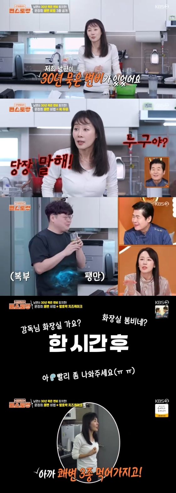 배우 문정희가 30년 묵은 변비를 퇴치하는 쾌변 비법을 공개했다. 9일 방송된 KBS 2TV '신상출시 편스토랑'에는 장 건강을 위한 특급 비법을 선보이는 '편셰프' 문정희의 모습이 그려졌다.