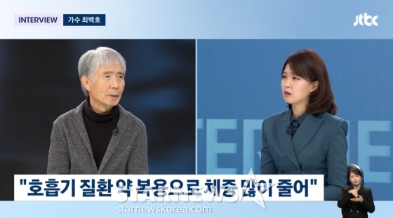 가수 최백호가 호흡기 질환으로 인해 체중 15kg가 빠졌다고 밝혔다.11일 오후 방송된 JTBC '뉴스룸'에는 최백호가 출연했다.