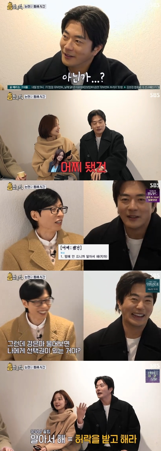 이에 유재석은 "요즘 상우가 제일 자주 하는 말 중의 하나가 '아닌가?'라고 하더라"라고 언급해 궁금증을 자아냈다. 권상우는 "와이프가 내 질문에 대답을 바로 안 하면 내가 '아닌가?'라고 하고, 와이프가 얘기하다가 의견 충돌하면 '어찌 됐건'이라고 한다"라고 설명해 웃음을 자아냈다. 이때 유재석은 "경은 씨가 저한테 제일 많이 하는 말은 '내 말 들었어?'다"라고 고백해 현장을 폭소케 했다. 모두가 비난하는 가운데 그는 "들었지. 안 듣겠냐. 생각할 시간이 필요한 거다"라고 변명했다.