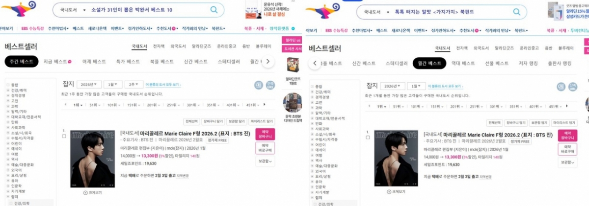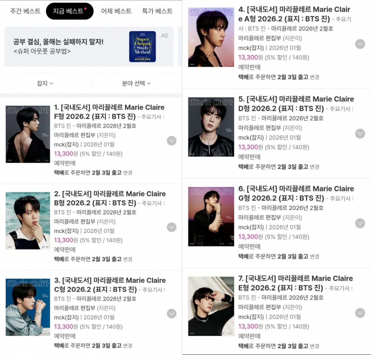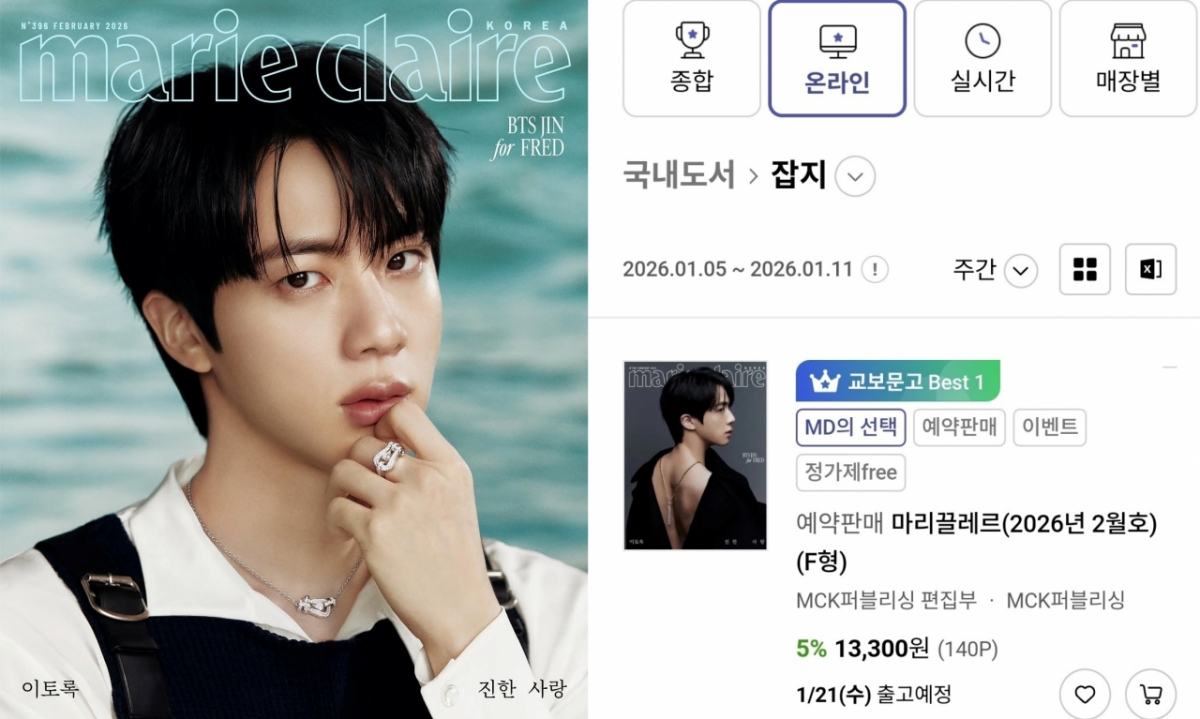 한편 일본 패션 잡지 SPUR는 수년간의 요청 끝에 2026년 1월호 표지 모델로 진을 선정했다. 해당 잡지는 예약 판매 시작과 동시에 아마존 재팬 베스트셀러 1위를 기록했고, 교보문고에서도 품절되며 일본 내에서도 진의 인기를 확실히 입증했다.