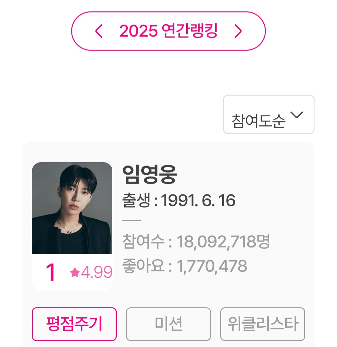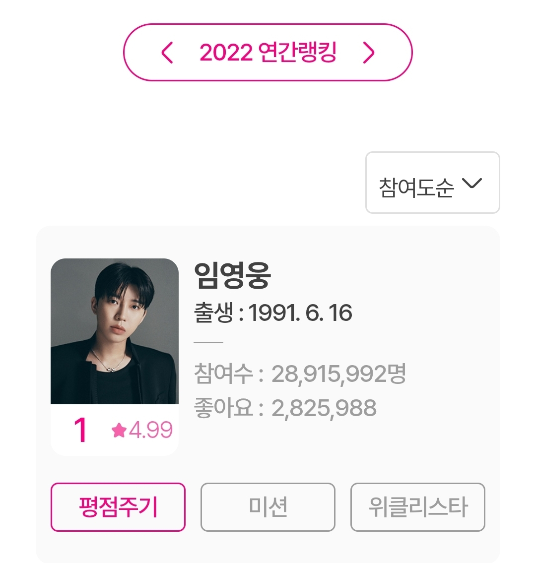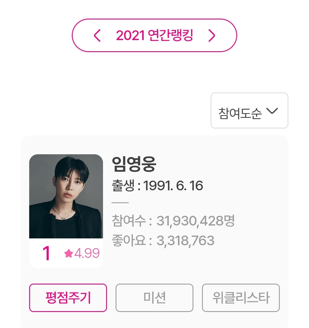 가수 임영웅이 아이돌차트 평점랭킹에서 5년 연속 연간 랭킹 1위를 차지하며 독보적인 인기를 입증했다. 임영웅은 2021년부터 2025년까지 5년 동안 단 한 번도 1위 자리를 내주지 않았다. 아이돌차트 집계에 따르면 임영웅은 2021년부터 2025년까지 평점 4.99점을 유지했다. 2021년에는 '임영웅 신드롬'의 시작을 알리며 가장 높은 수치를 기록했다. 당시 참여수는 3193만 428명, 좋아요는 331만 8763개였다. 2022년에는 2년 연속 1위를 유지하며 참여수 2891만 5992명, 좋아요 282만 5988개를 기록했다. 2023년에는 2265만 7056명의 참여와 220만 7653개의 좋아요를 얻으며 3년 연속 정상을 지켰다.