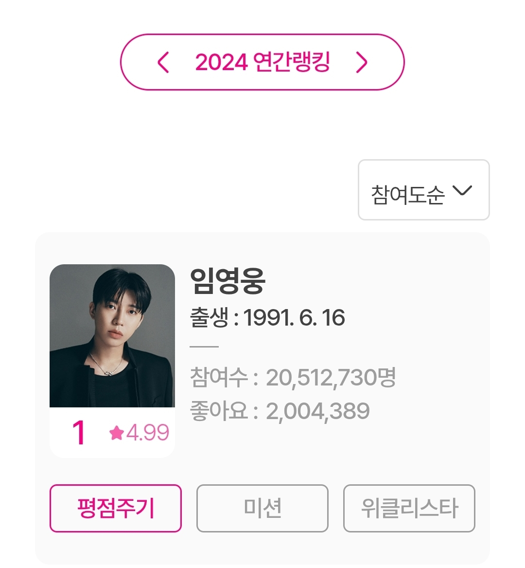 2024년에는 변함없는 인기를 이어가며 '히어로 파워'를 과시했다. 참여수는 2051만 2730명, 좋아요는 200만 4389개를 기록했다. 2025년에는 참여수 1809만 2718명, 좋아요 177만 478개를 기록하며 5년 연속 1위를 달성했다.이 같은 대기록은 단순한 수치를 넘어 임영웅이라는 브랜드가 가진 신뢰와 팬들의 충성도를 보여주는 결과다. 그는 트로트뿐 아니라 발라드, 팝 등 다양한 장르를 소화하며 전 세대를 아우르는 '국민 가수'로 자리매김했다.