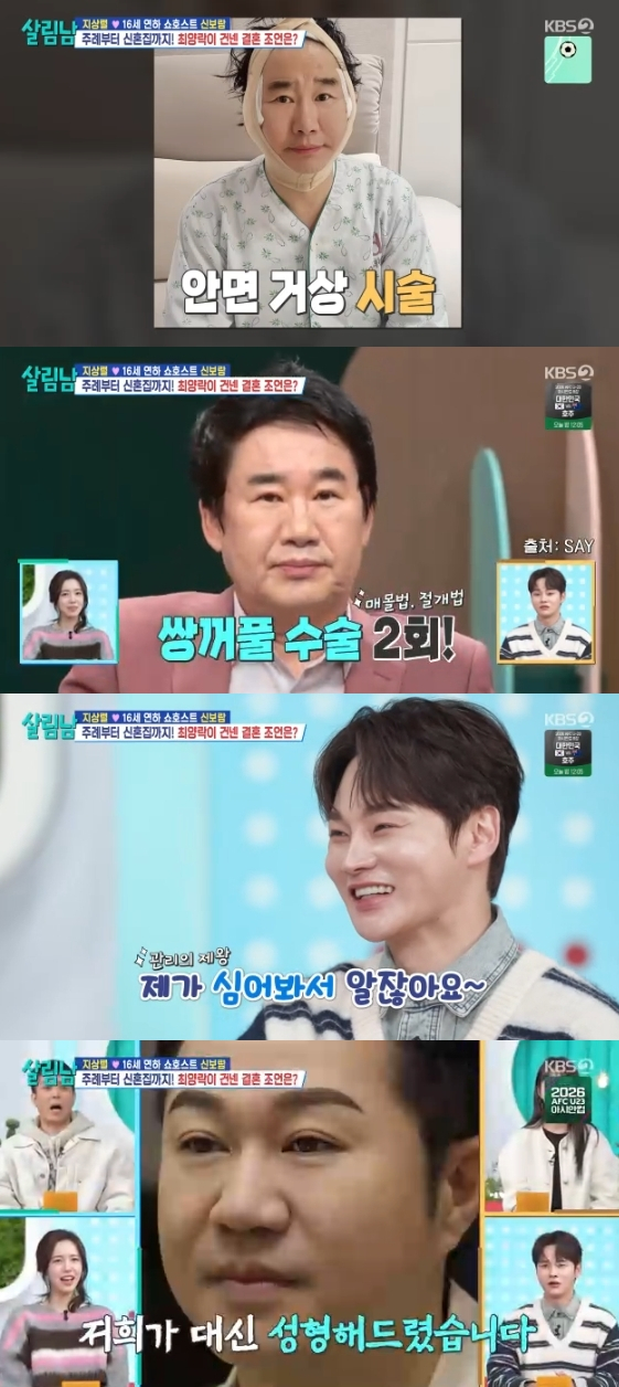 코미디언 최양락이 성형을 고백했다. 17일 방송된 KBS 2TV 예능 프로그램 '살림하는 남자들 시즌2'에는 100째 연애 중인 16세 연하 쇼호스트 신보람을 집으로 초대한 지상렬의 모습이 그려졌다.