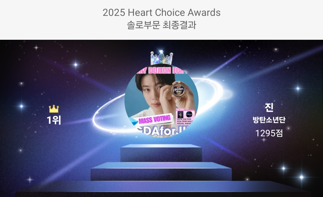 방탄소년단(BTS) 진이 '2025 하트 초이스 어워즈(Heart Choice Awards)' 솔로 아티스트 초이스 부문에서 1위를 차지하며 글로벌 인기를 빛냈다.