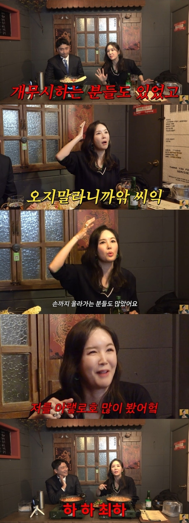 그러자 장영란은 "솔직히 말씀드리면 정말 개무시하는 분들도 있었다. '오지말라니까 씨'라며 손까지 올라가는 분들이 많았다"면서 "이제서야 얘기하는데 예능이 너무 힘들었다. 왜냐하면 치고 빠지는 게 너무 힘들다 보니까. 출연자들이 그때 나를 아래로 봤다. 진짜 이거 리얼이다. 나를 아래로 많이 봤다. 진짜 하 하 하 최하로 봤다. 땅굴까지 팔 정도로"라고 예능인의 고충을 털어놨다.