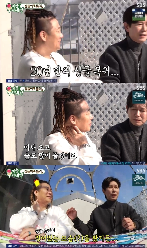 이후 윤민수의 테라스를 방문한 김민종은 "20년 만에 돌아왔는데 혼자 사는 기분이 어떠냐"라고 근황을 물었다. 이에 윤민수는 "좋다. 이사 오고 술도 많이 줄였다"라고 담담하게 고백했다.