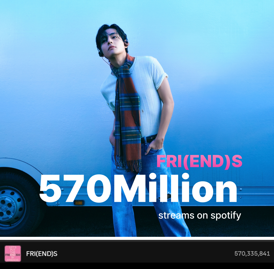 방탄소년단(BTS) 뷔의 솔로곡 '프렌즈'(FRI(END)S)가 스포티파이에서 5억 7000만 스트리밍을 돌파하며 인기를 빛냈다.디지털 싱글 '프렌즈'는 18일 세계 최대 음원 스트리밍 플랫폼 스포티파이(Spotify)에서 5억 7000만 스트리밍을 기록했다. '프렌즈'는 감미로운 멜로디와 위트 있는 가사의 팝 소울 R&B 장르로 저음과 가성을 자유자재로 넘나드는 뷔의 다양한 음색을 감상할 수 있다.