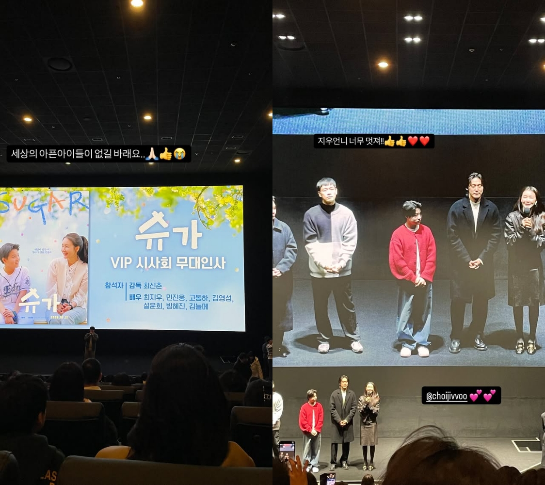이어 이윤지는 "지우 언니 초대로 꽃 한 아름 안고 밤마실. 엄마가 된 언니의 눈물의 온도는 더욱 뜨거워져 있었다. 너무 아름다운 그녀의 새 영화"라고 '슈가'를 홍보했다.