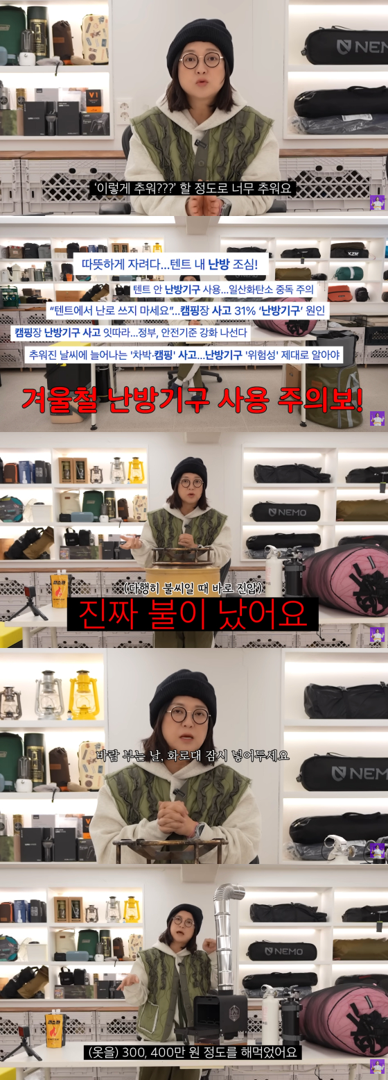 영상에서 김숙은 "캠핑에는 정답이 없다"며 겨울철 캠핑 사고와 직결되는 화로대, 난로 사용법에 대해 설명했다.