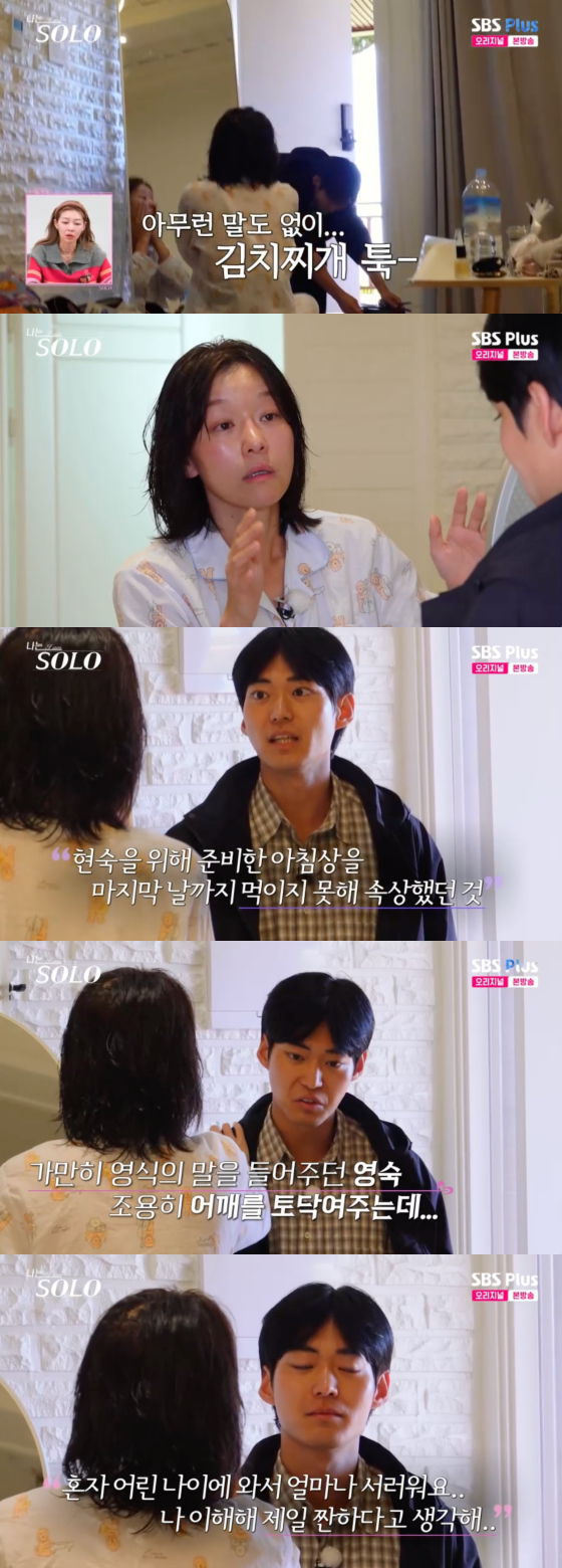 '나는 솔로' 29기 영식이 교수인 영숙의 손길 한 번에 설움이 폭발했다.21일 방송된 ENA, SBS플러스 연애 예능 프로그램 '나는 솔로'에서는 29기 영식이 현숙을 위해 김치찌개를 끓이는 모습이 그려졌다.