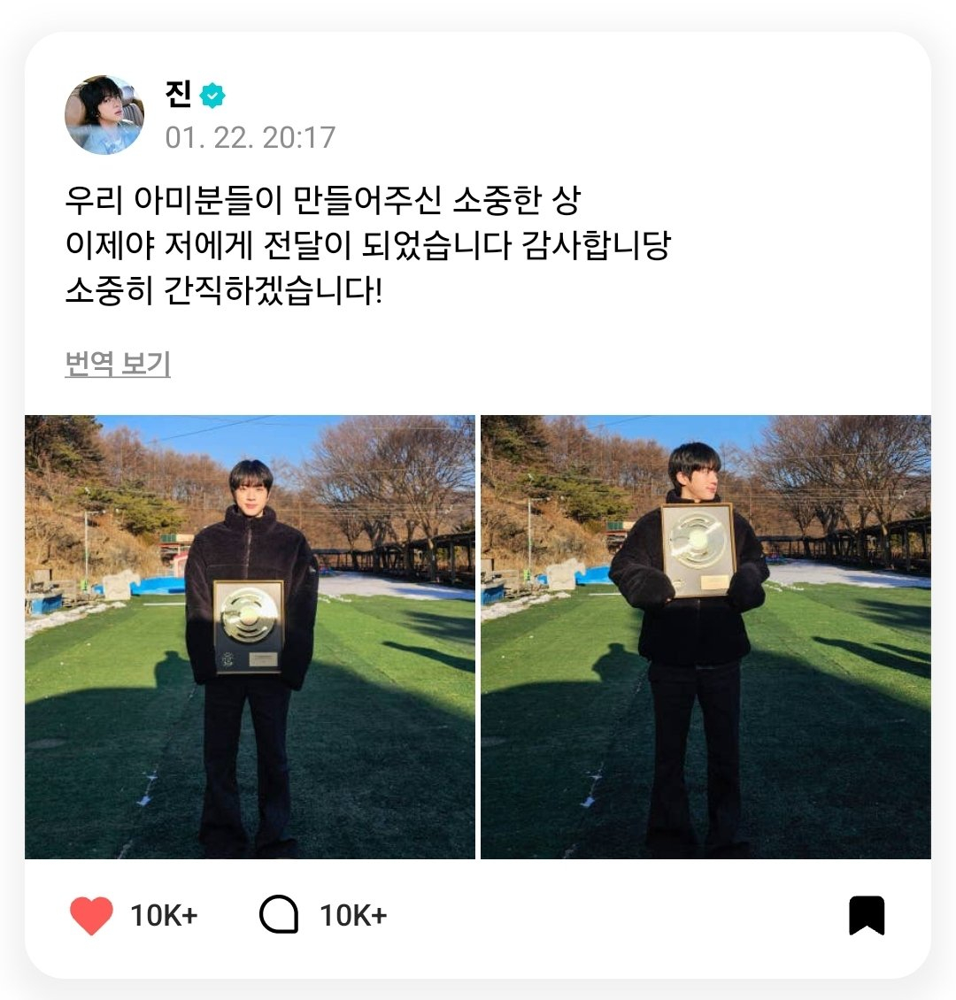 방탄소년단(BTS) 진이 수상 인증을 하며 팬들에게 감사 인사를 전했다. 진은 지난 22일 글로벌 팬 커뮤니티 위버스에 상을 들고 있는 사진 2장을 공개했다.
