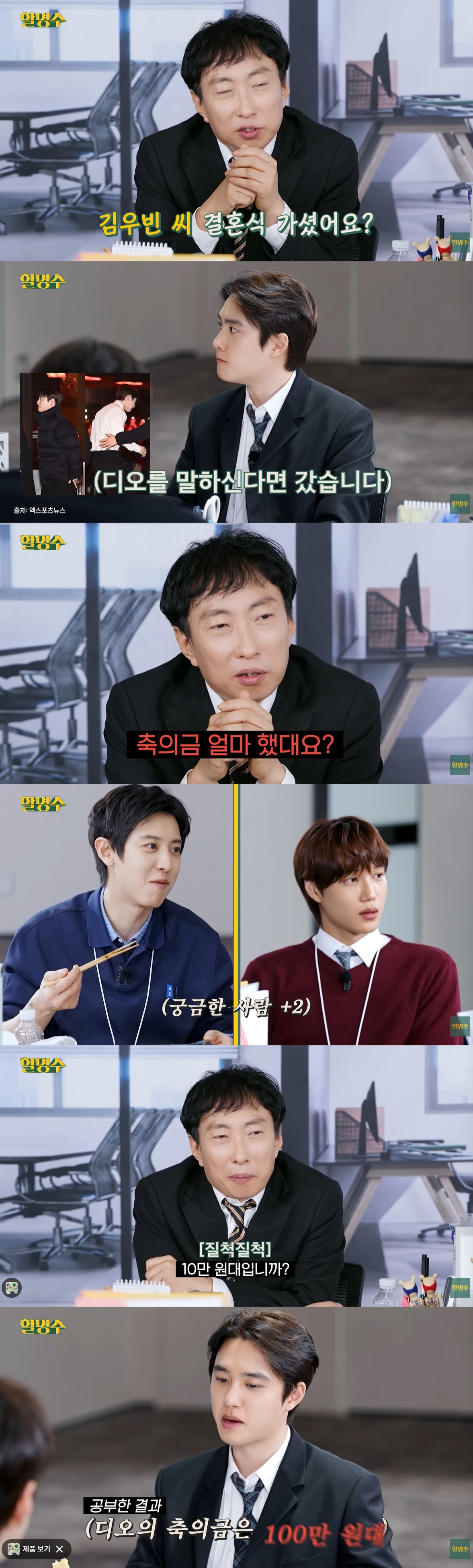 이와 관련해 박명수는 '축의금 얼마 했냐', 찬열 역시 '궁금하다'라고 물었다. 도경수는 묵묵부답으로 일관했으나 박명수가 '10만 원대입니까, 100만 원대입니까'라고 꼬치꼬치 묻자 결국 '100만 원대다'라고 입을 열었다.