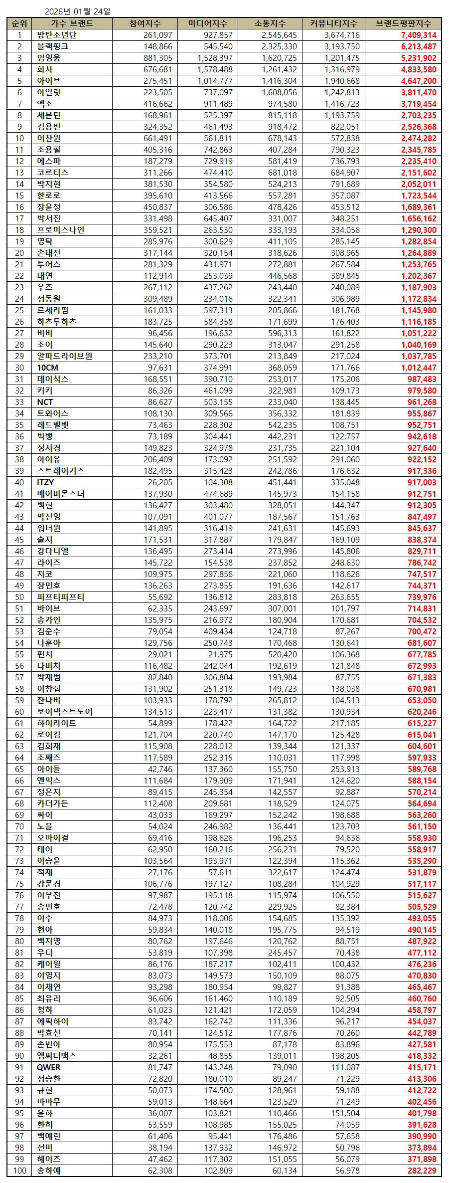한국기업평판연구소는 2025년 12월 24일부터 2026년 1월 24일까지의 가수 브랜드 빅데이터 116,391,810개를 분석하여 소비자들의 브랜드 참여, 미디어, 소통, 커뮤니티 분석을 했다. 지난 12월 가수 브랜드 빅데이터 108,476,322개와 비교하면 7.30% 증가했다. 가수 브랜드평판지수는 소비자들에게 사랑받는 음원을 선보이고 있는 가수 브랜드 빅데이터를 추출하고 소비자 행동분석을 하여 참여가치, 소통가치, 미디어가치, 커뮤니티가치로 분류하고 긍부정비율 분석과 평판분석 알고리즘을 통해 분석된 지표이다. 브랜드 평판분석을 통해 브랜드에 대해 누가, 어디서, 어떻게, 얼마나, 왜, 이야기하는지를 알아낼 수 있다.