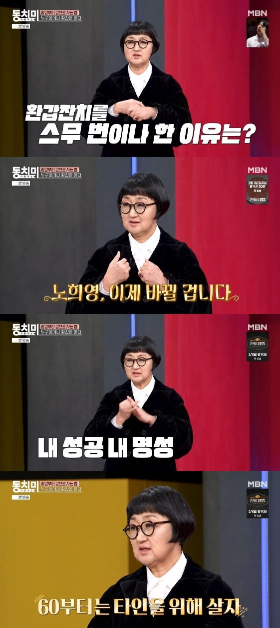 브랜드 컨설턴트 노희영이 남다른 인생관을 밝혔다. 24일 방송된 MBN 예능 프로그램 '속풀이쇼 동치미'는 '환갑부터 갑으로 사는 법'이라는 주제로 꾸며진 가운데 노희영이 출연해 자신만의 특별한 철학과 노하우를 공개했다.