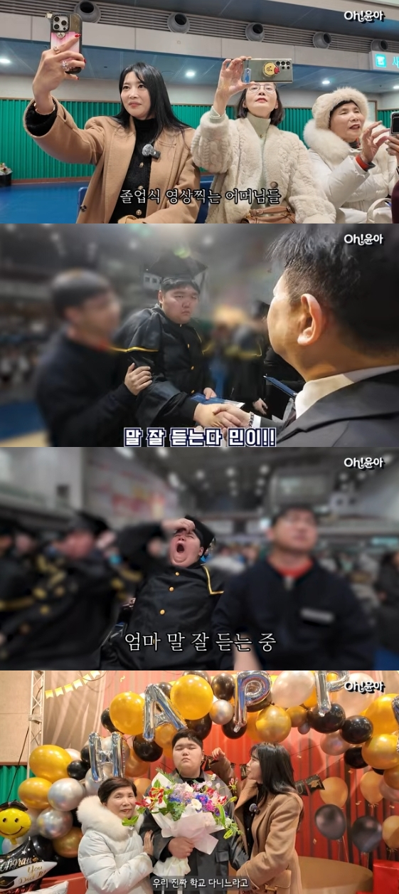 이날 친언니, 어머니와 함께 졸업식을 찾은 오윤아는 "민이가 받을 상이 있느냐"는 제작진의 질문에 "졸업장 말고는 없다. 개근상은 특히 못 받는다"라며 웃음을 터뜨렸다.