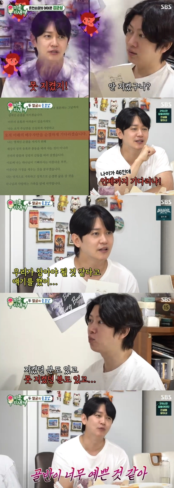 이날 강균성은 김희철을 집으로 초대해 2011년도에 작성한 혼전순결 서약서를 공개했다. 그는 서약서를 신기한 듯 바라보는 김희철에게 "부족하다. 부끄러워진다"며 서약을 지키지 못했다고 실토했다.