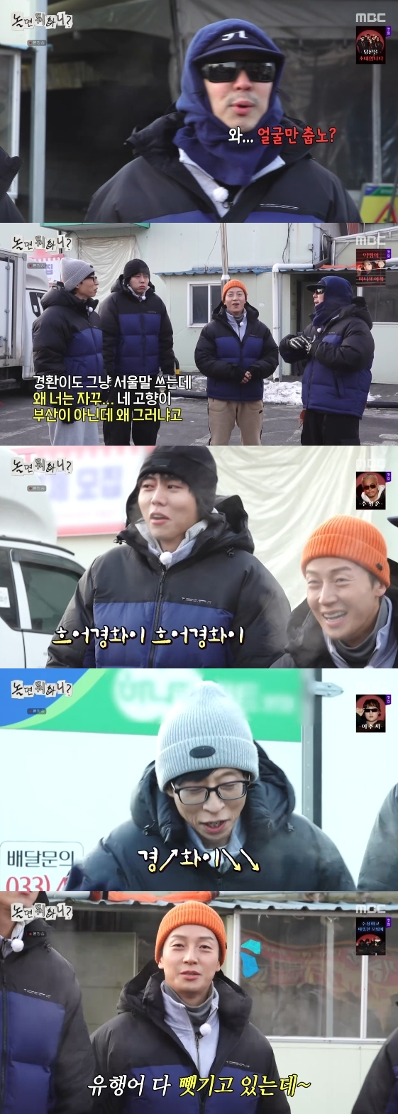 이날 멤버들은 영하 17도에 이르는 강추위에 말을 잇지 못했다. 하하가 "와, 얼굴만 춥노"라고 중얼거리자 유재석은 "경환이도 그냥 서울말 쓰는데 너는 네 고향이 부산도 아니면서 왜 그러냐"라고 지적했다.