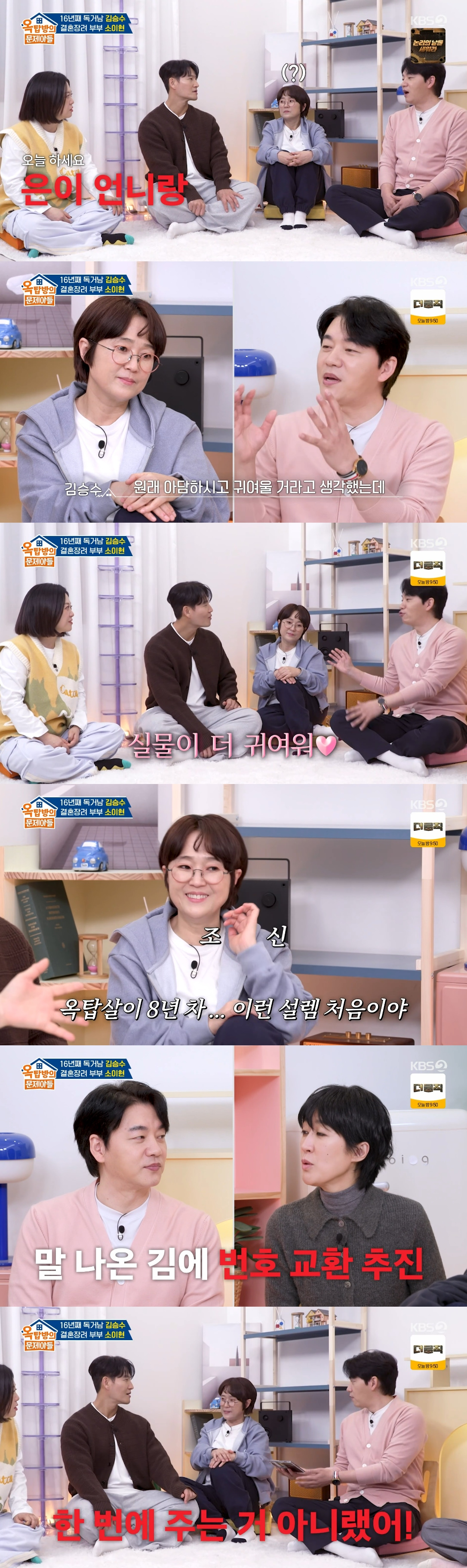 5일 오후 방송된 KBS 2TV '옥탑방의 문제아들'에는 김승수와 소이현이 게스트로 출연했다.