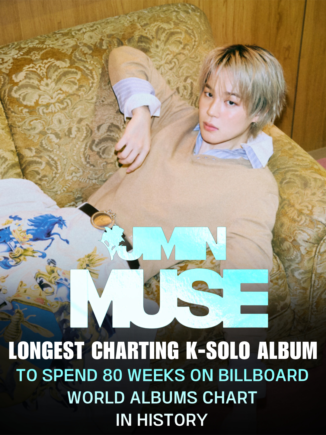 빌보드 월드 앨범 차트에서 'MUSE'로 80주 진입을 이루며 최장 진입 K팝 솔로앨범의 기록을 확장해 나가고 있는 지민은 앞서 'FACE' 63주 진입으로 두번째 최장 진입 기록을 함께 보유하고 있다.꾸준히 글로벌 인기를 이어오고 있는 'MUSE'는 2024년 빌보드 연간 결산차트에서 2024년 11위, 2025년 3위에 올랐으며 2023년 'FACE'가 5위에 오른 바 있어 지민은 해당 차트 3년 연속 진입 성과를 이뤘다. 또 지민은 빌보드 연말 결산 월드 앨범 아티스트 차트에 2023년 7위, 2024년 6위, 2025년 5위로 3년 연속 차트인하는 대기록을 세우기도 했다.