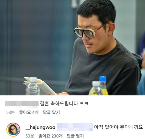 이번 게시글은 하정우가 차정원과 열애 인정 후 처음 올린 글이라는 점에서 네티즌들의 큰 관심을 받았다. 이에 한 팬은 "결혼 축하드린다"는 댓글을 남겼고, 하정우는 "아직 있어야 된다"며 결혼 일정은 정해진 바 없다고 답했다.