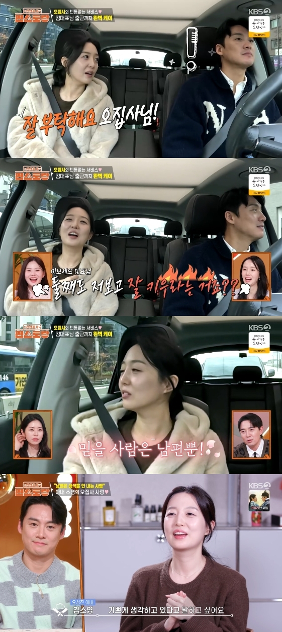 이에 오상진은 "계속 그 얘기밖에 안 한다. (아기를) 안 보겠다는 생각밖에 안 하냐"라고 발끈했다. 그러자 김소영은 "믿을 사람은 남편밖에 없다"라고 호소했고, 김준현은 "프렌치토스트 세 개만 해주면 제가 아기 하루 봐 드리겠다"라고 너스레를 떨어 웃음을 안겼다.
