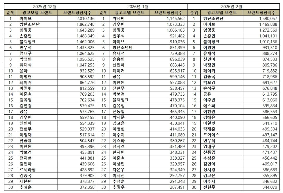 2026년 2월 광고모델 브랜드평판 30위 순위는 방탄소년단, 아이브, 임영웅, 손흥민, 블랙핑크, 이병헌, 유재석, 신민아, 박정민, 페이커, 김종국, 박보검, 손석구, 공유, 이주빈, 에스파, 이찬원, 김혜윤, 아일릿, 탁재훈, 트와이스, 변우석, 엄태구, 신동엽, 추성훈, 김연아, 성시경, 김고은, 이수지, 전현무 순으로 분석됐다.