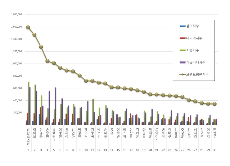 임영웅 브랜드는 참여지수 181,238 미디어지수 289,449 소통지수 487,448 커뮤니티지수 314,434가 되면서 브랜드평판지수 1,272,569로 분석됐다. 지난 1월 브랜드평판지수 1,066,183과 비교해보면 19.36% 상승했다.