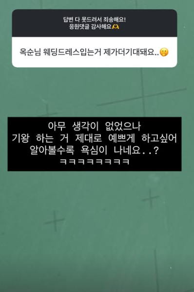 앞서 28기 옥순은 결혼식 관련 질문을 받고 "사실 보여지는 것보다 진짜 마음이 더 중요해서 할까말까 고민했는데 딸이 결혼식을 해야 아내와 남편이 되는 거라고 얼른 하라고 해서 구상 중입니다"라며 "웨딩드레스 아무 생각 없었으나 기왕 하는 거 제대로 예쁘게 하고 싶어 알아볼수록 욕심이 나네요?"라고 답했다.