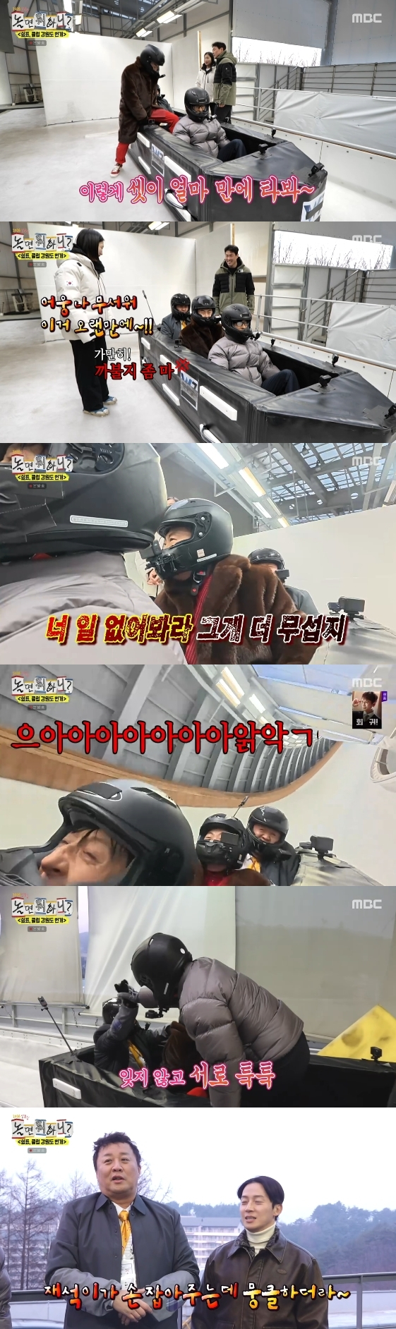 방송인 유재석이 박명수, 정준하와 17년 만에 봅슬레이를 탄 뒤 뭉클함을 전했다. 14일 방송된 MBC 예능 프로그램 '설특집 놀면 뭐하니?'에는 강원도에서 '쉼표, 클럽' 긴급 번개 모임을 가지는 유재석, 하하, 허경환, 주우재, 정준하와 신입 회원 박명수의 모습이 그려졌다.