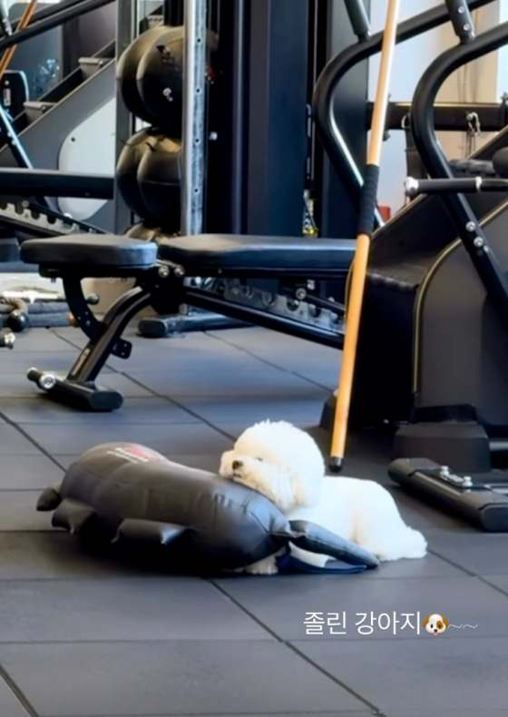 공개된 영상에는 헬스장 안에서 운동용 쿠션에 턱을 괸 채 잠든 송혜교의 반려견 루비의 모습이 담겼다.