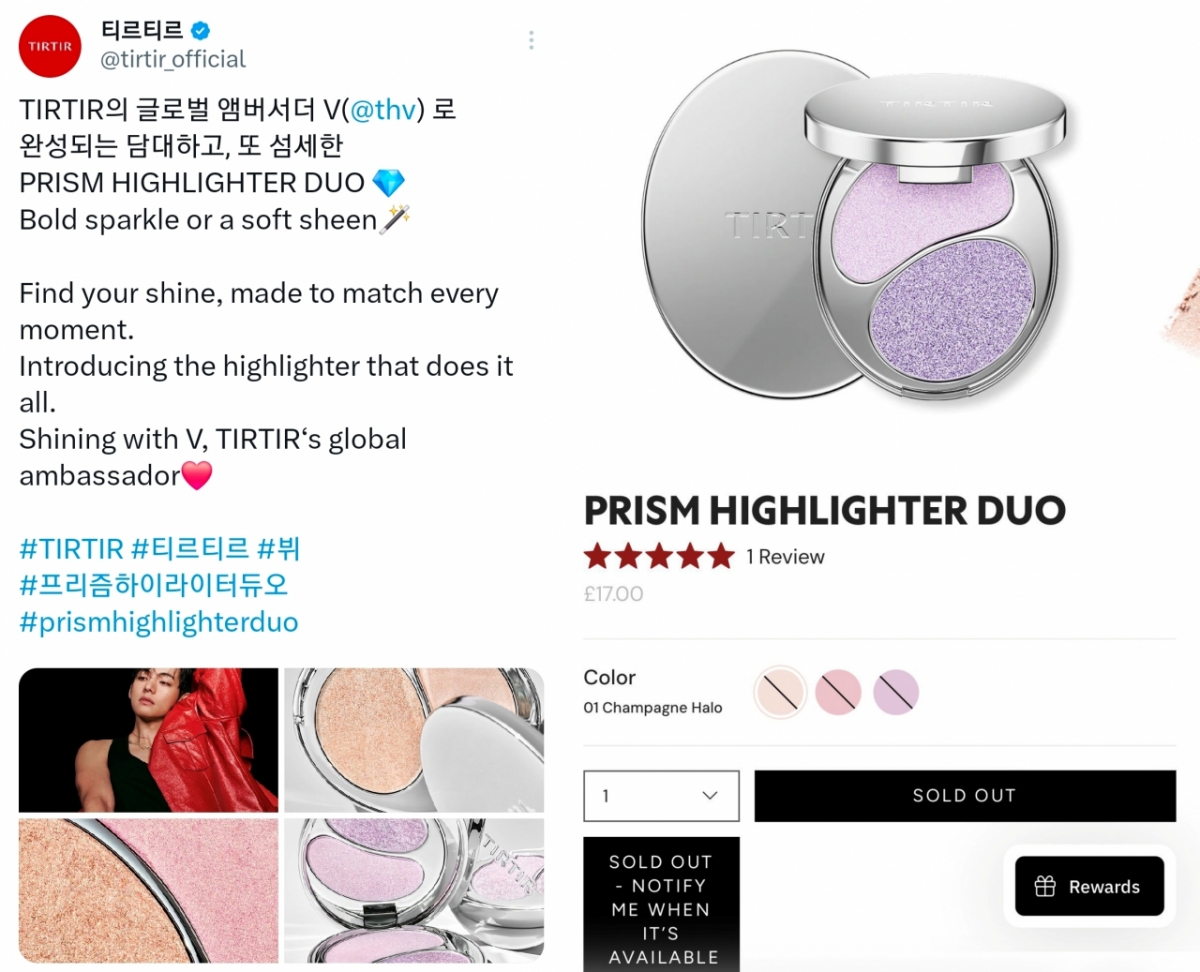 해당 제품은 공지 후 몇 시간 만에 티르티르 글로벌 공식몰에서 모든 색상이 품절됐다. 이로 인해 프리즘 하이라이터 듀오는 새로운 인기 제품으로 급부상하고 있다. 앞서 티르티르는 뷔를 글로벌 앰버서더로 발탁하고, 마스크 핏 레드 쿠션을 주력 제품으로 한 캠페인을 성공적으로 진행한 바 있다.