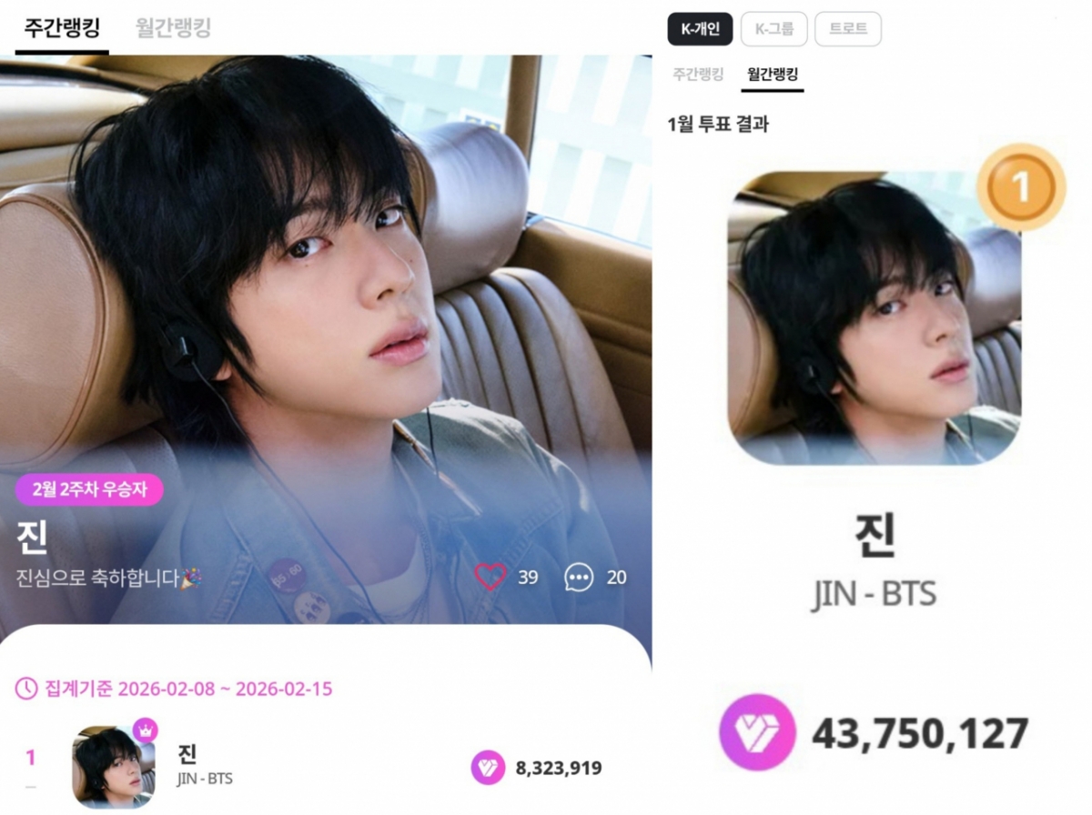 진은 글로벌 팬 투표 플랫폼 '마이원픽(my1pick)' K-POP 개인 부문 주간 랭킹 2월 2주차(2월 8일~2월 15일)에서 832만 3919표를 얻으며 1위에 올랐다. 이로써 103주 연속 1위를 기록하며 탄탄한 팬덤 파워와 영향력을 다시 한 번 입증했다.