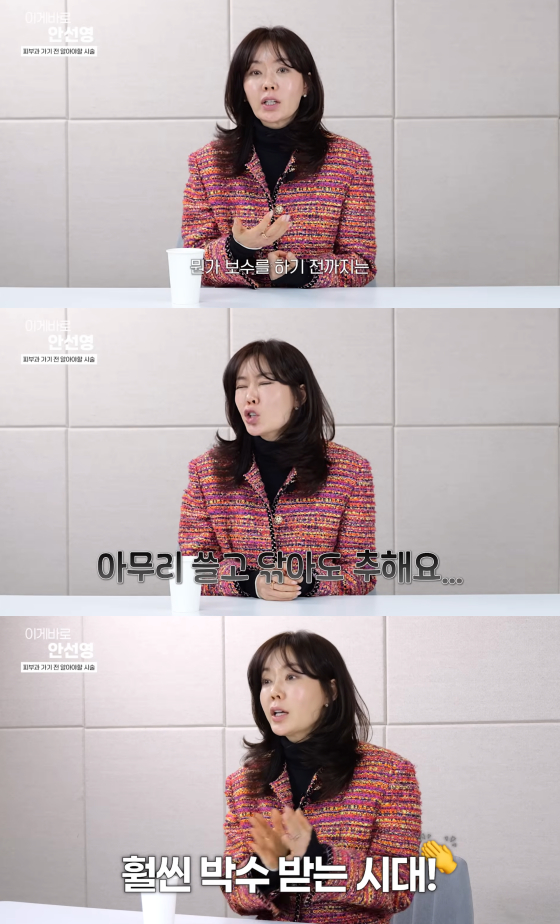 이에 안선영은 "딩동댕"이라고 호응한 뒤 "일단은 집, 차, 여자. 요즘은 남자도 마찬가지지만 사람이라 치자. 세 개의 공통점이 있다. 연식이 될수록 유지 보수 비용이 많이 들고 보수를 하기 전까지는 아무리 쓸고 닦아도 추하다"고 발언했다.