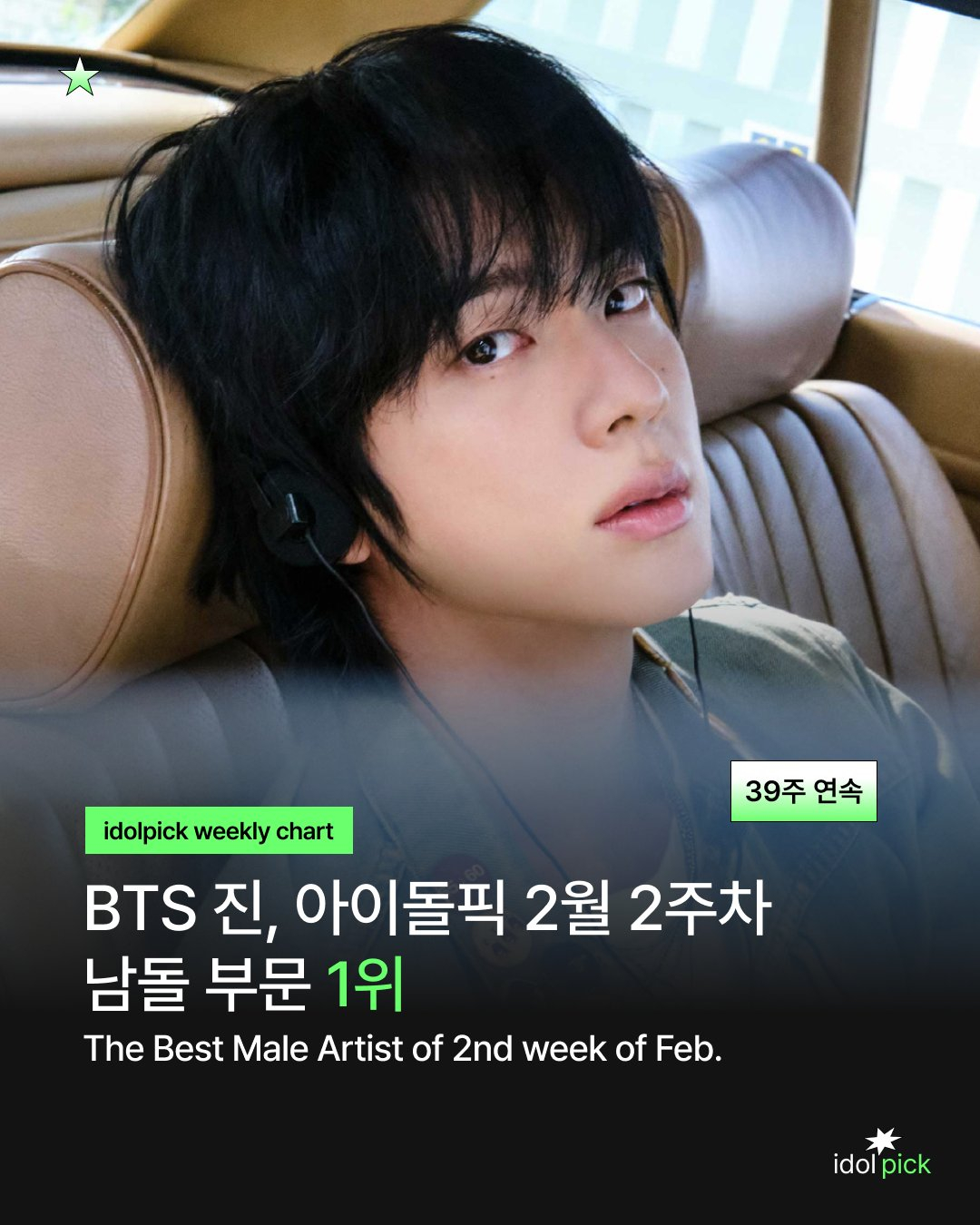 진은 아이돌 투표 서비스 '아이돌픽(idolpick)' 2월 2주차(2026년 2월 9일~2월 15일) 위클리 차트 남자 아이돌 부문에서 5만 2388포인트를 획득하며 1위에 올랐다. 이로써 해당 부문 39주 연속 정상을 지켰다. 더불어 이번 위클리 투표에서 최다 득표를 기록, 전체 부문 통합 1위까지 차지하며 막강한 팬덤 파워를 입증했다.