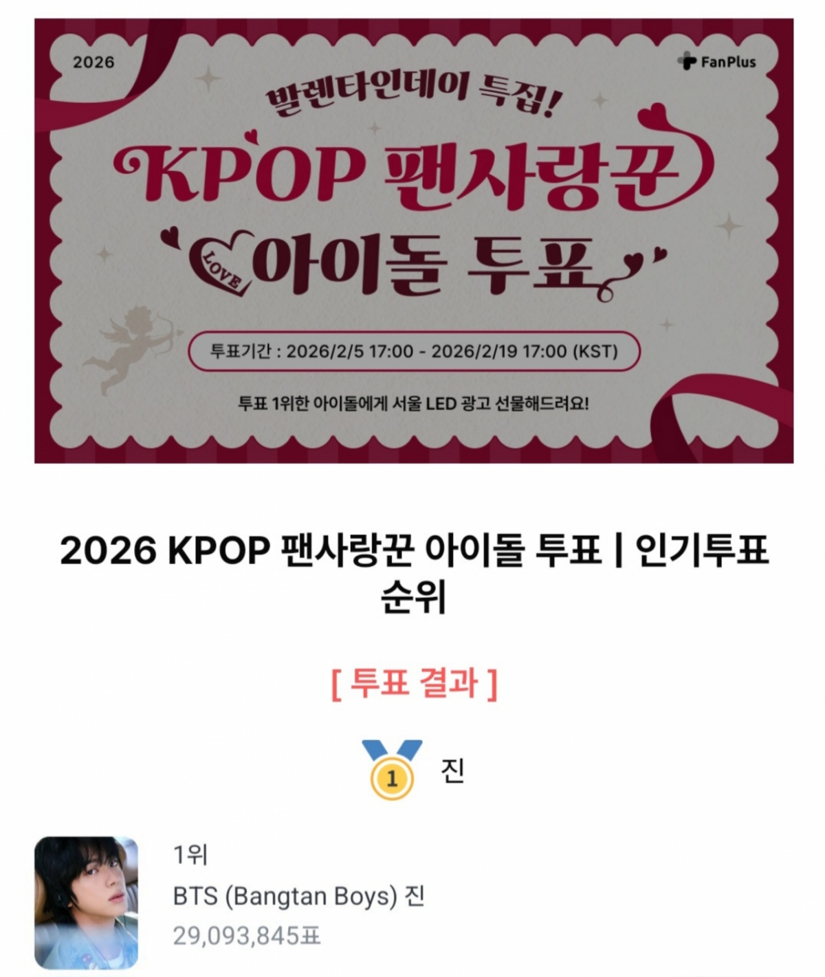 팬 커뮤니티 플랫폼 팬플러스(FanPlus)가 지난 2월 5일부터 2월 19일까지 진행한 이번 투표에서 진은 총 2909만 3845표를 획득하며 정상에 이름을 올렸다.