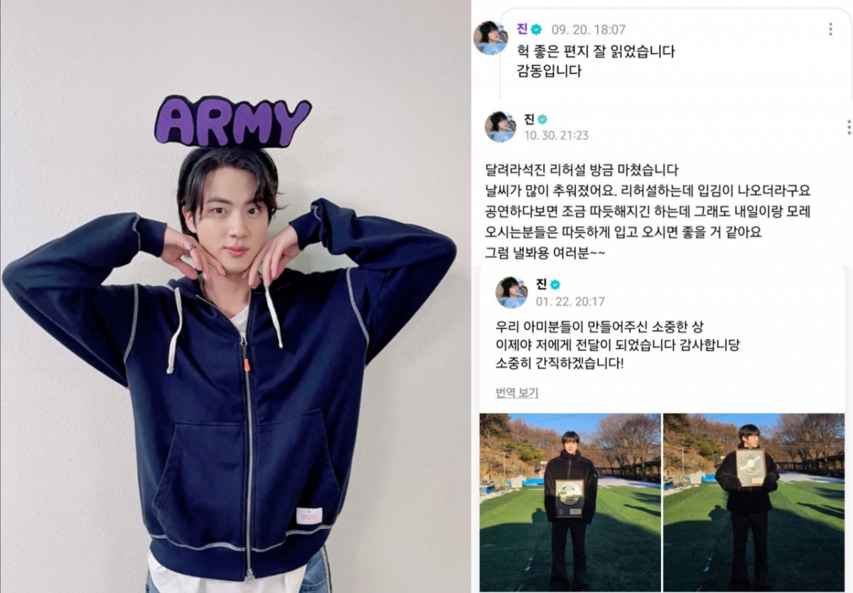 실제 진은 팬들과의 교감에서도 늘 진심을 드러내왔다. 그는 팬 편지에 "흑 좋은 편지 잘 읽었습니다. 감동입니다"라고 답하며 고마움을 전했고, 팬들이 마련한 상을 전달받은 뒤에는 "우리 아미분들이 만들어주신 소중한 상 이제야 저에게 전달이 되었습니다. 감사합니다. 소중히 간직하겠습니다!"라며 벅찬 마음을 표현했다.