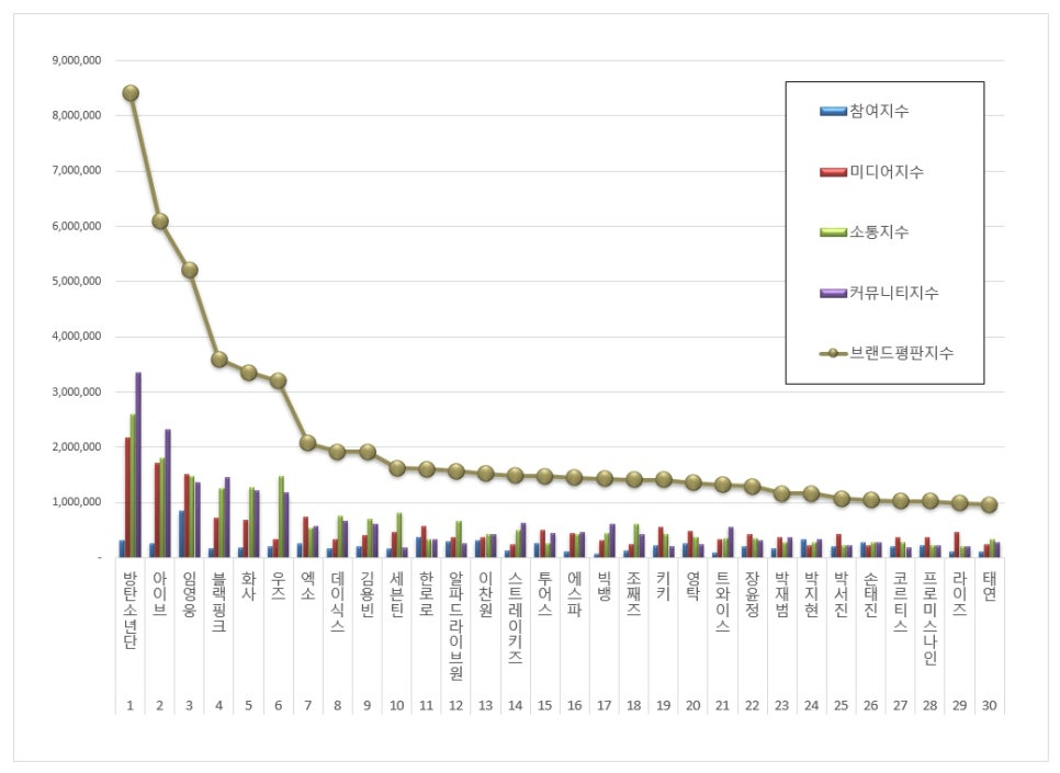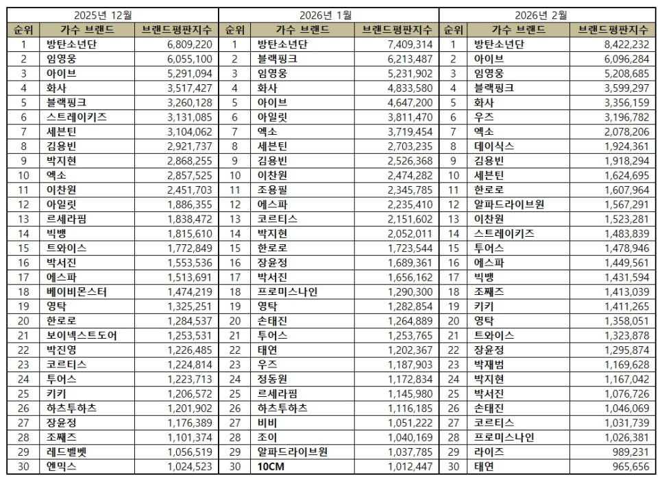 2026년 2월 가수 브랜드평판 30위 순위는 방탄소년단, 아이브, 임영웅, 블랙핑크, 화사, 우즈, 엑소, 데이식스, 김용빈, 세븐틴, 한로로, 알파드라이브원, 이찬원, 스트레이키즈, 투어스, 에스파, 빅뱅, 조째즈, 키키, 영탁, 트와이스, 장윤정, 박재범, 박지현, 박서진, 손태진, 코르티스, 프로미스나인, 라이즈, 태연 순으로 분석됐다.